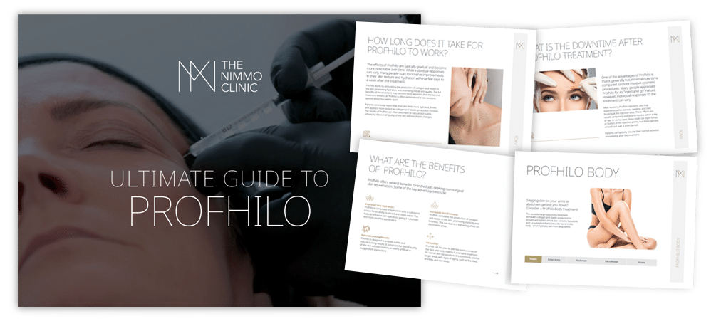 After Profhilo treatment, patients will typically experience a small red bumps at the injection sites for around 3 hours after treatment, with the potential for mild tenderness in the treated sight for a couple of days. In areas such as the lips and chin, it is likely the swelling and potential ‘stiffness’ can last up to 24-48 hours after treatment. Occasionally, some patients will have a small localised bruises for a few days following treatment which can usually be covered with concealer if required. Dr. Martin Nimmo will explain all the pertinent and rare risks with you at your consultation to ensure you are fully informed prior to proceeding to treatment.
